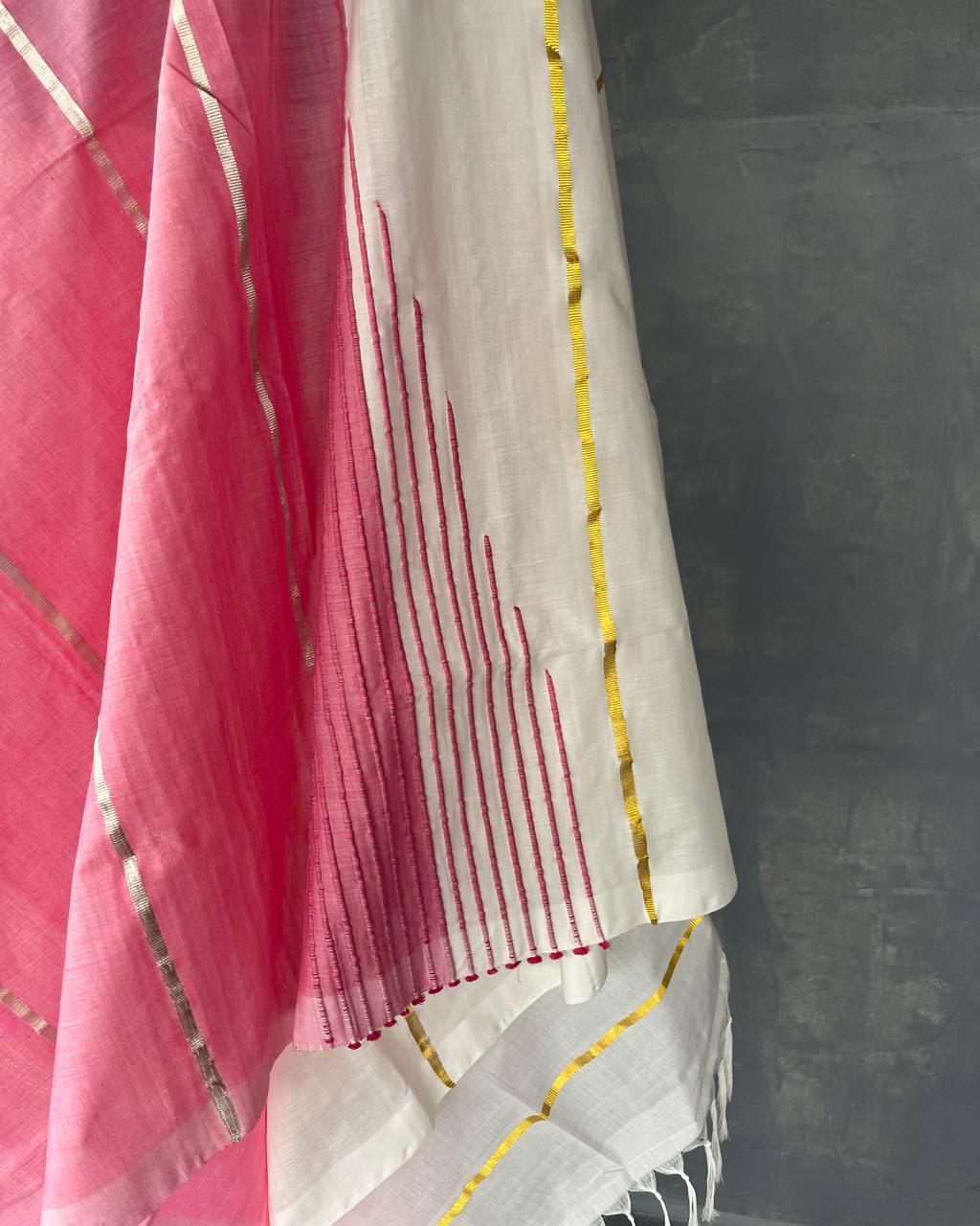 HANDWOVEN COTTON KASAVU SAREE WITH FLORAL APPLIQUÉD DETAILS
