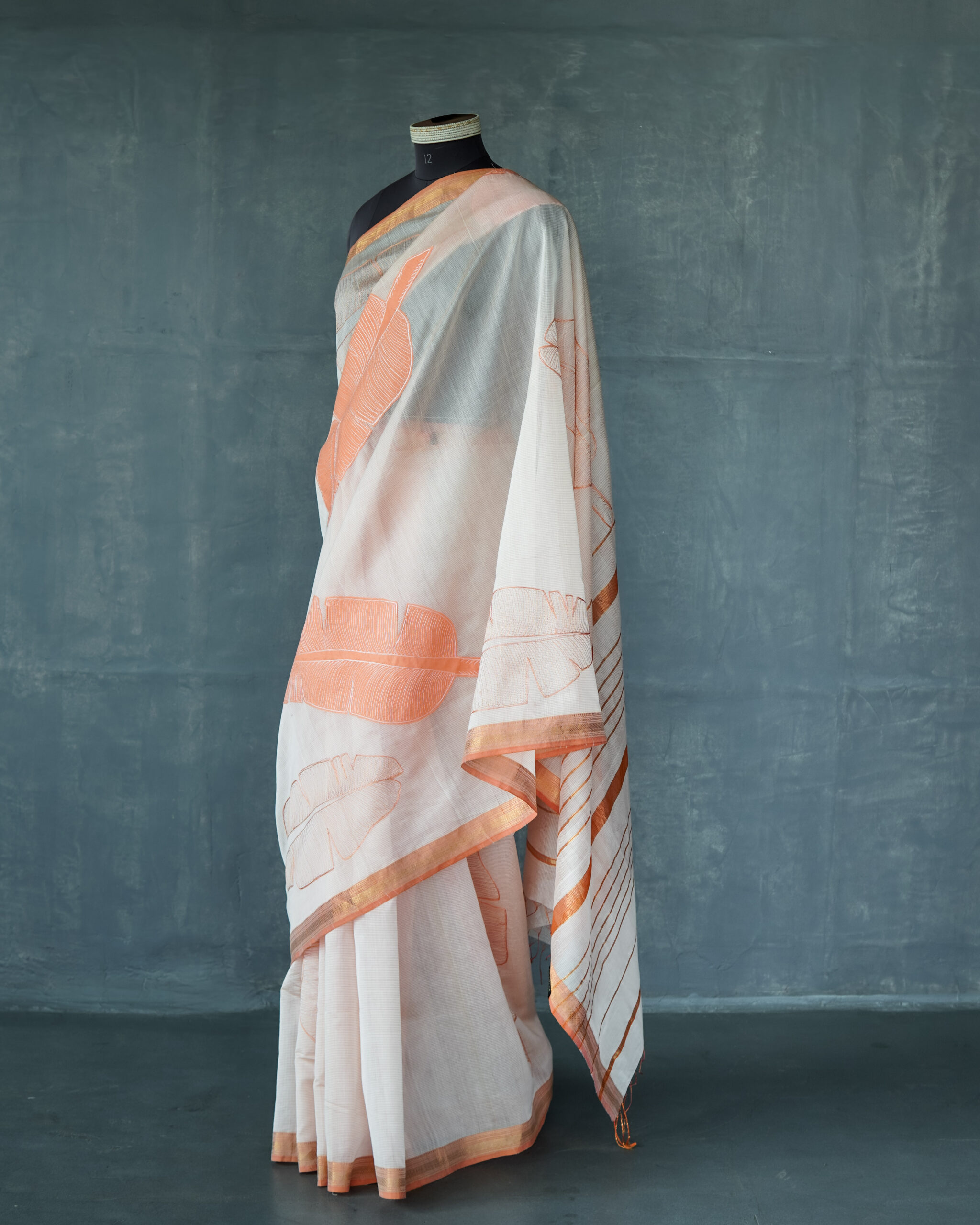 MAHESHWARI SAREE WITH APPLIQUE AND EMBROIDERY DETAILS .