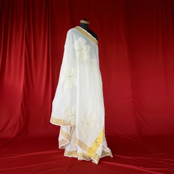 HANDWOVEN COTTON KASAVU SAREE WITH FLORAL APPLIQUÉD DETAILS