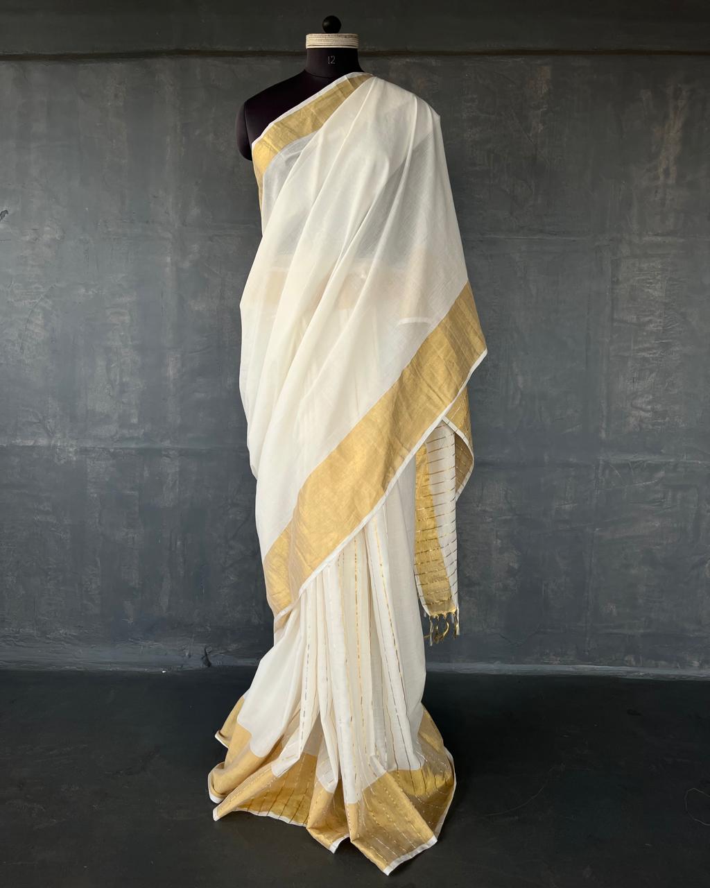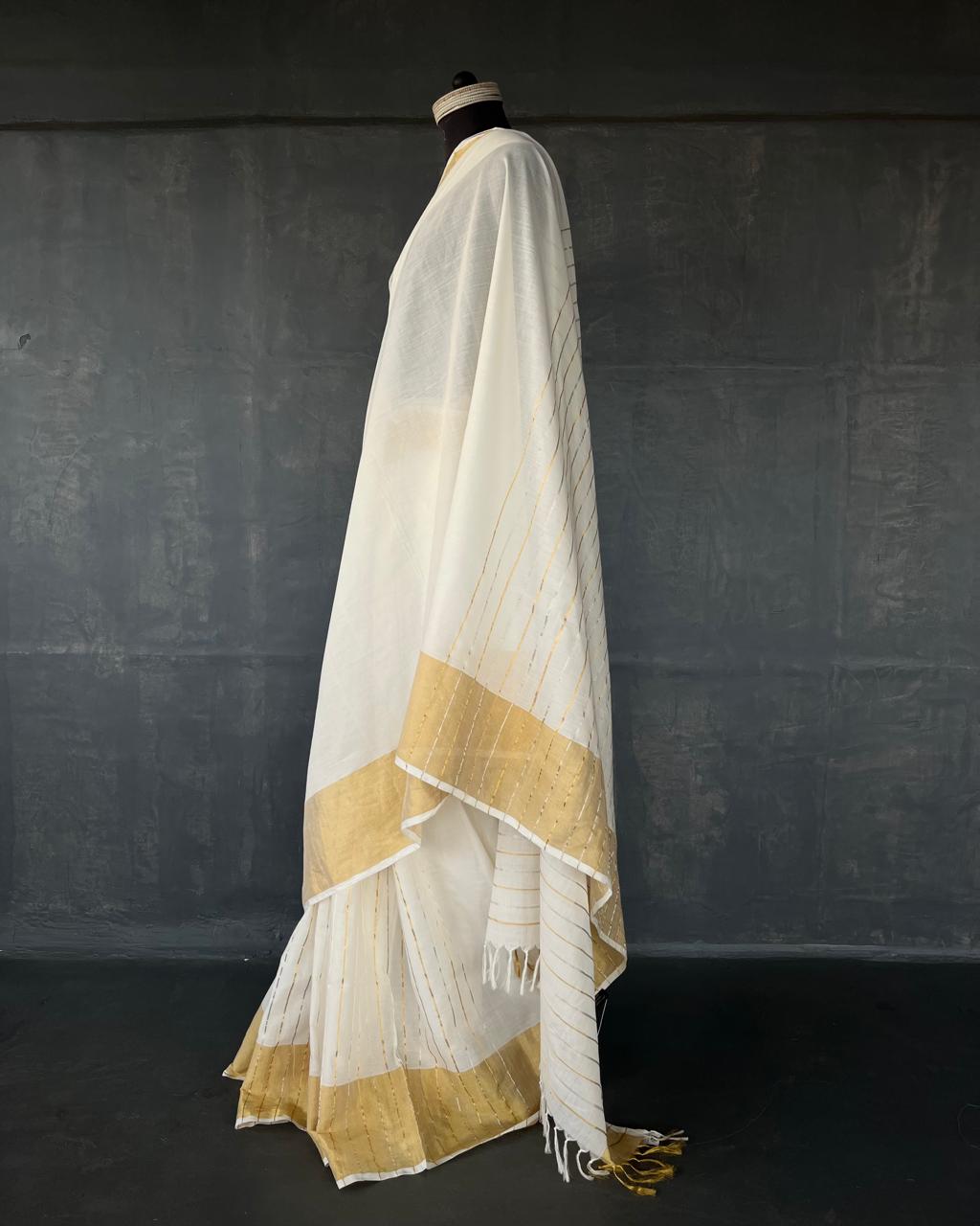 HANDWOVEN COTTON KASAVU SAREE WITH ZARI DETAILS.