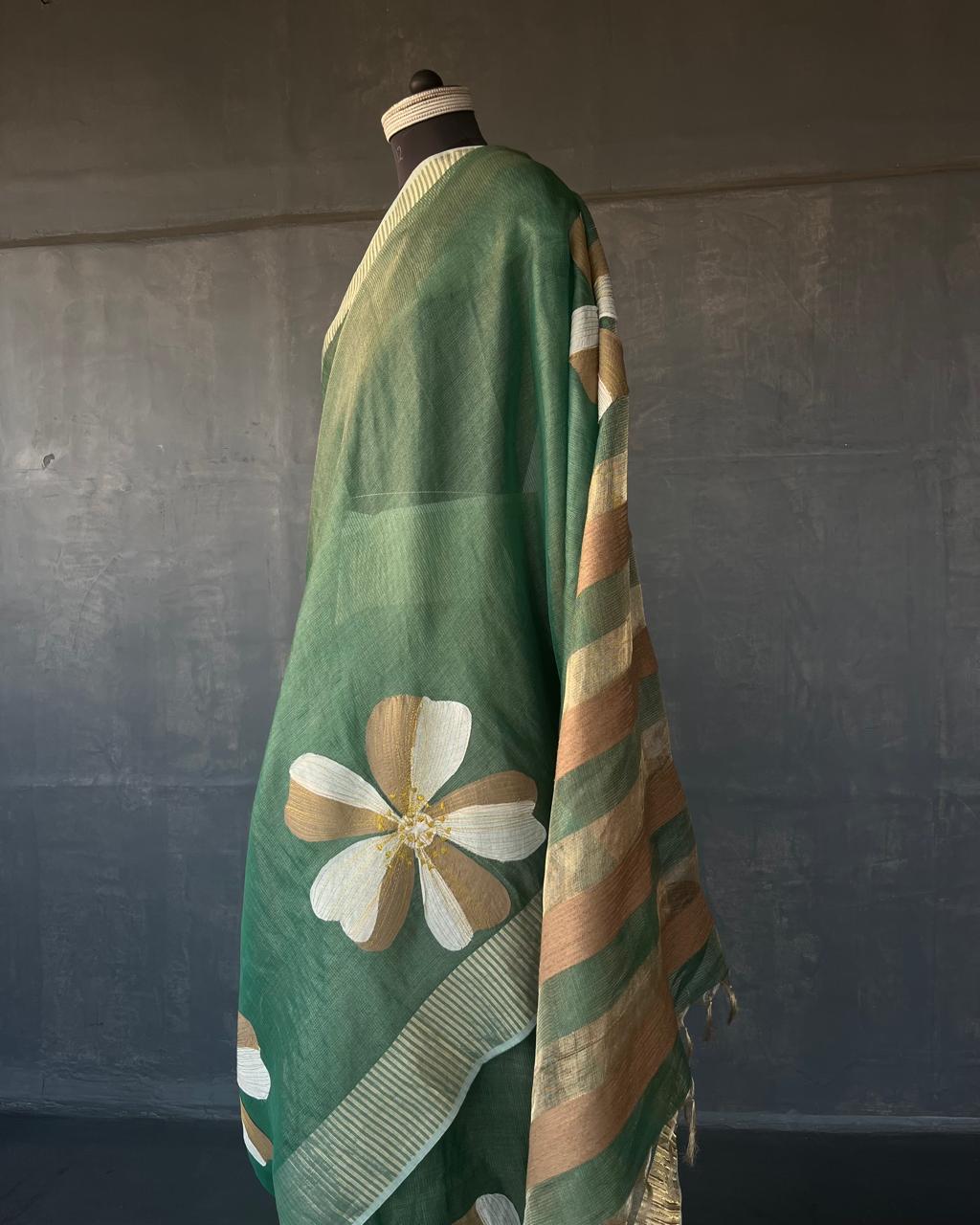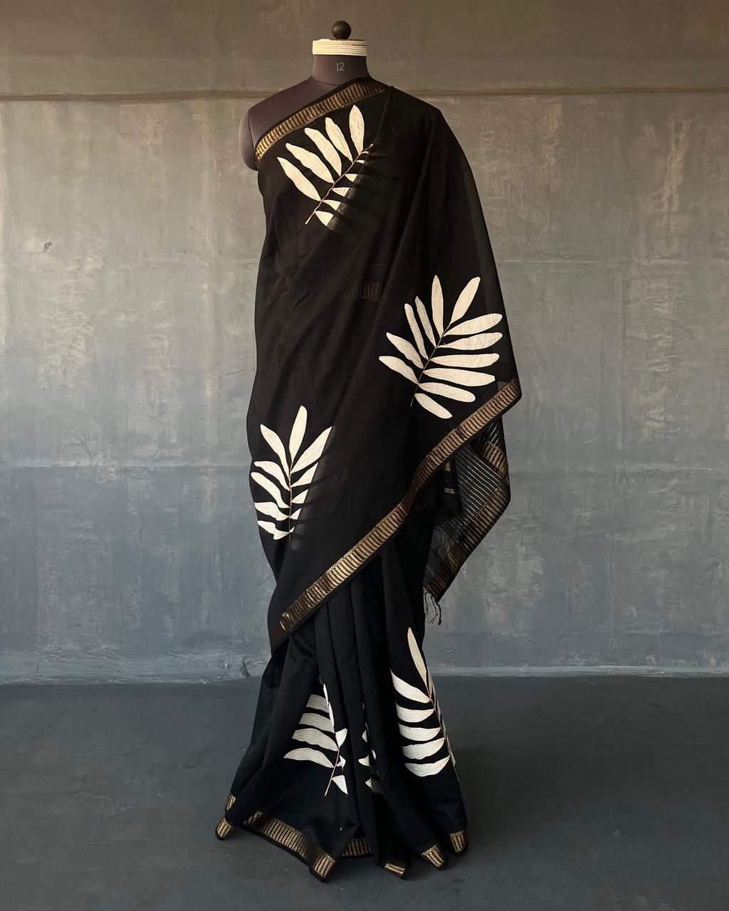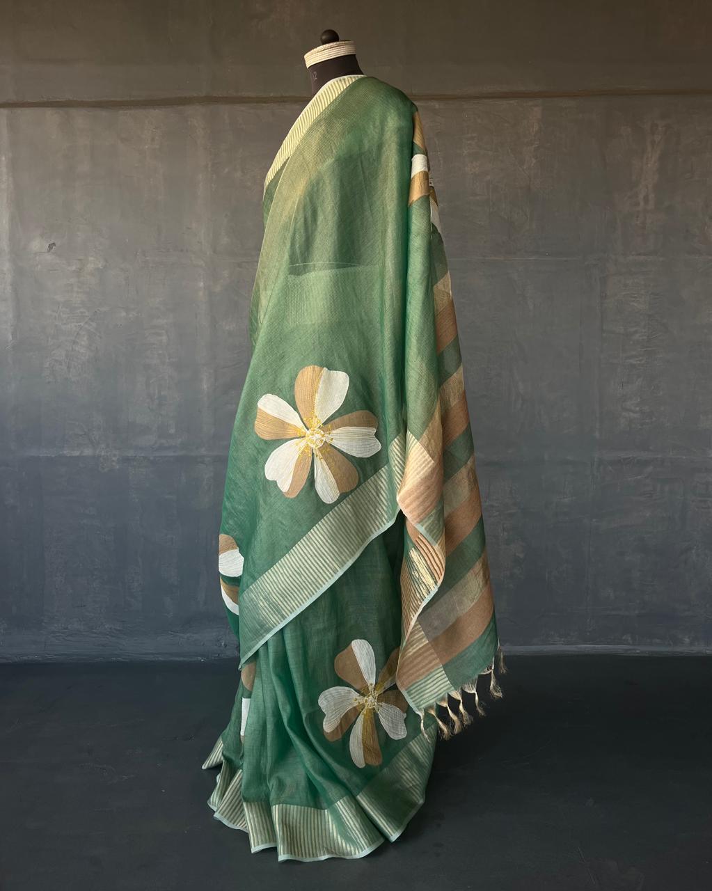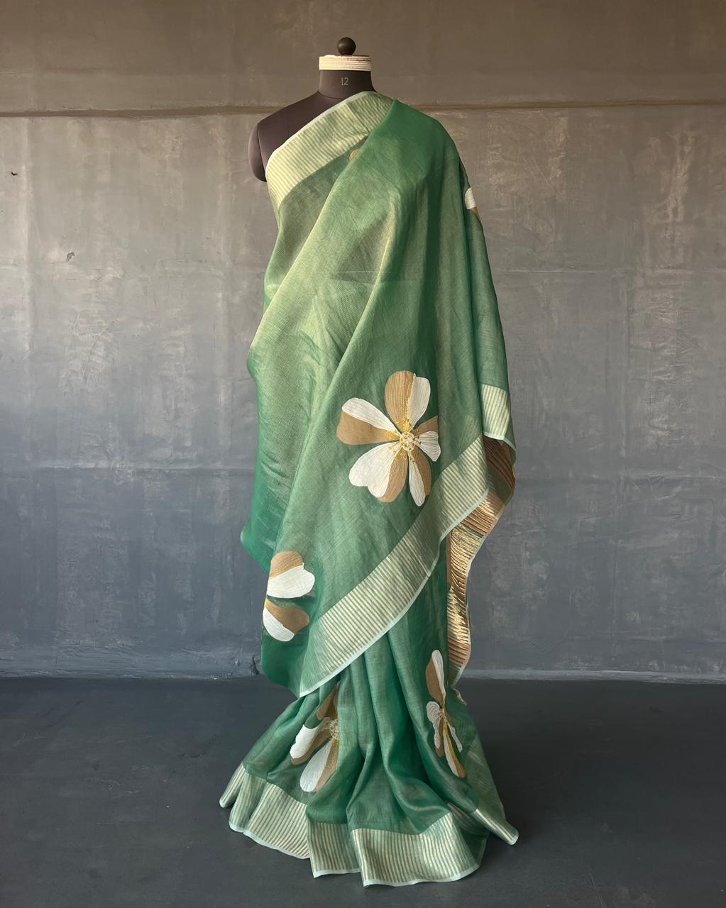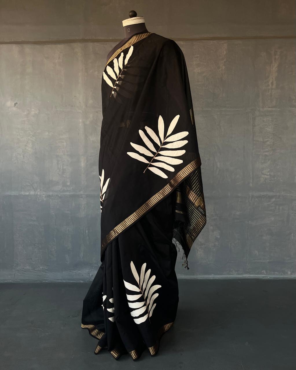 TUSSAR TISSUE SAREE WITH APPLIQUÉD DETAILS.