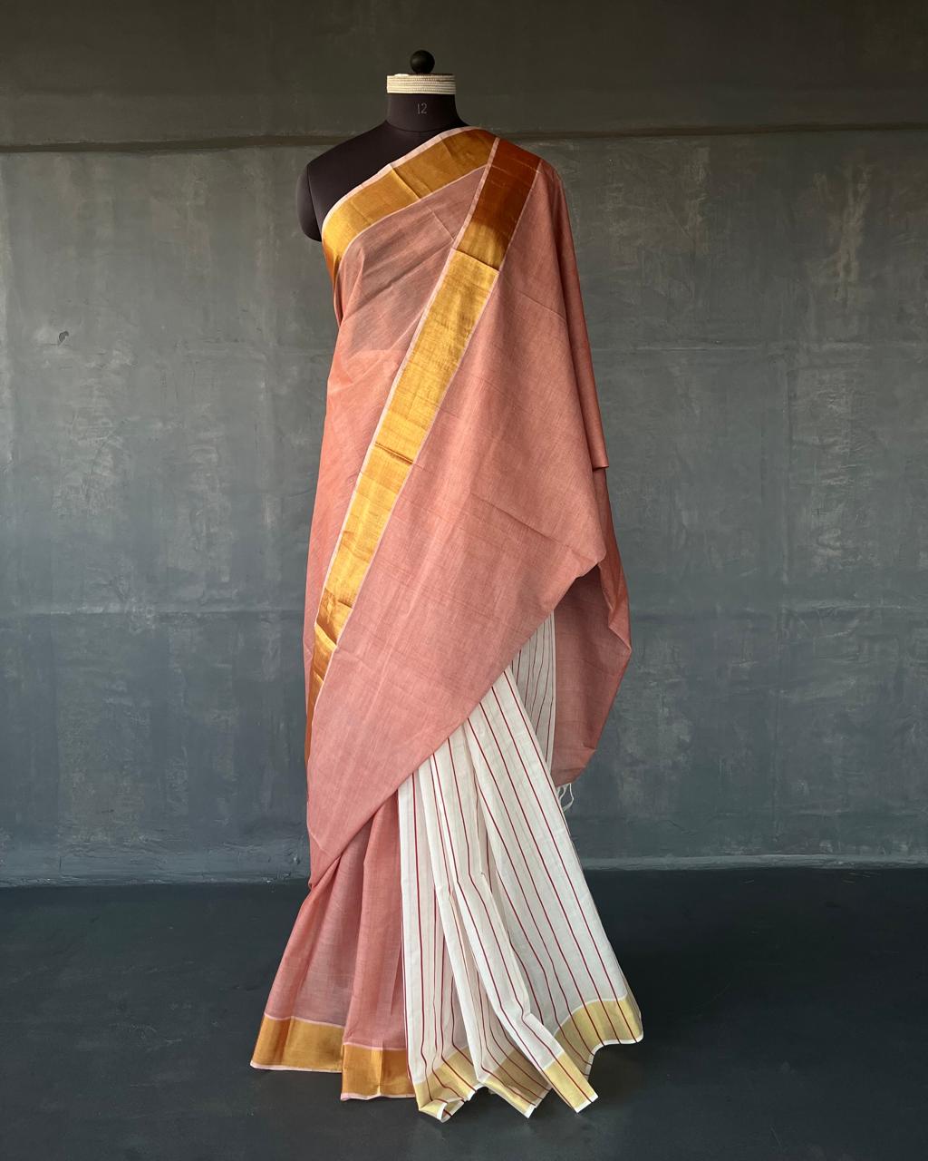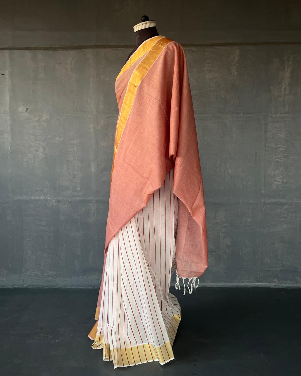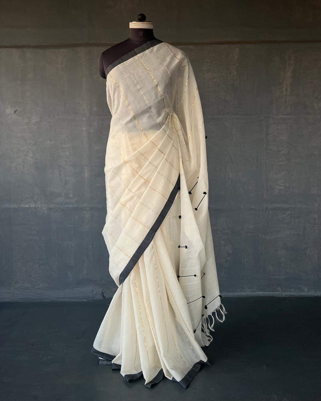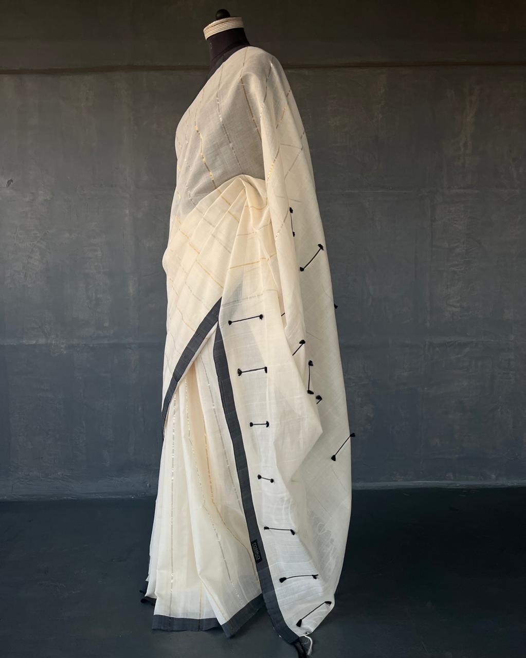 This saree is a part of our #everyinchoffabric initiative and unfinished edges are a part of the design sensibility.