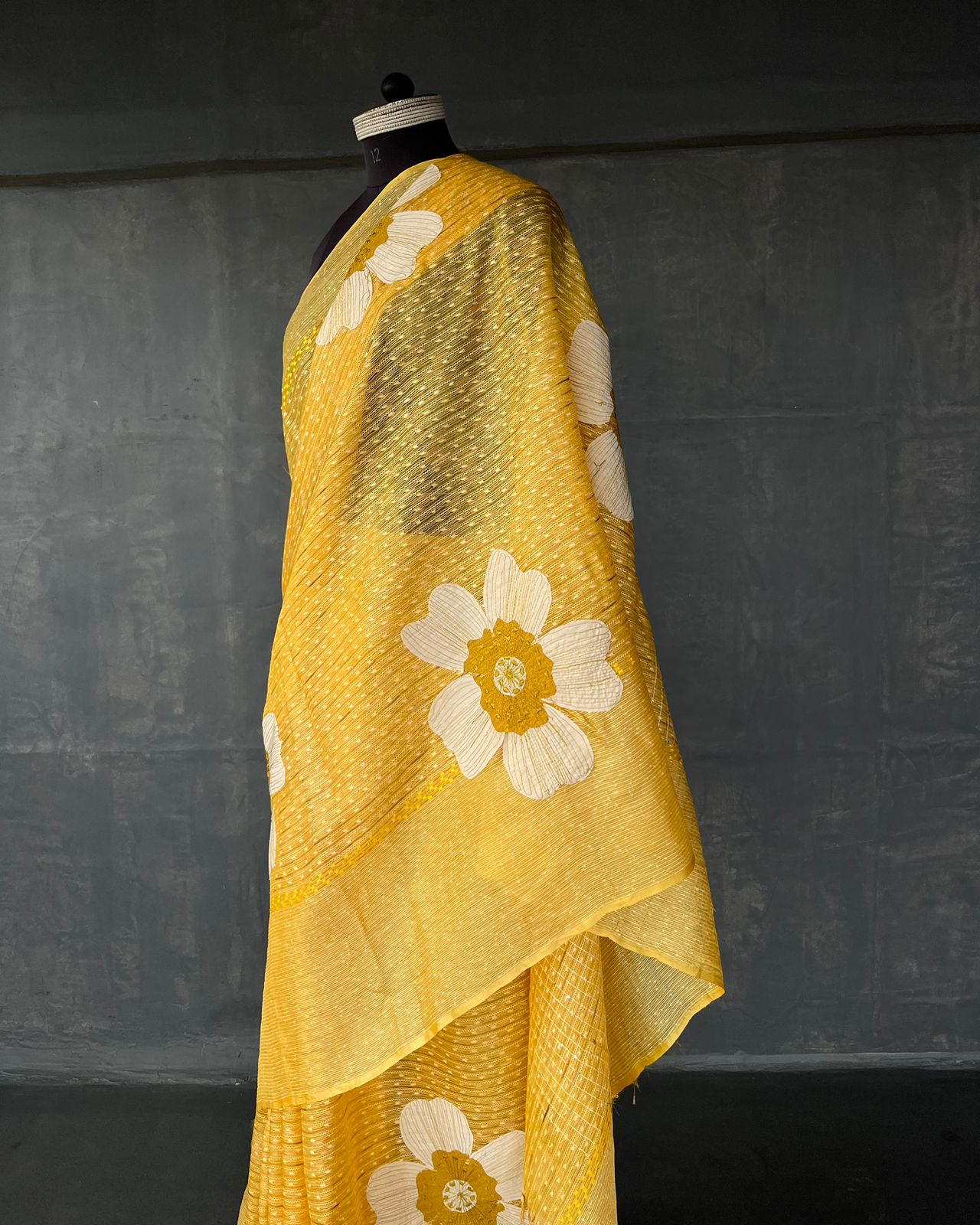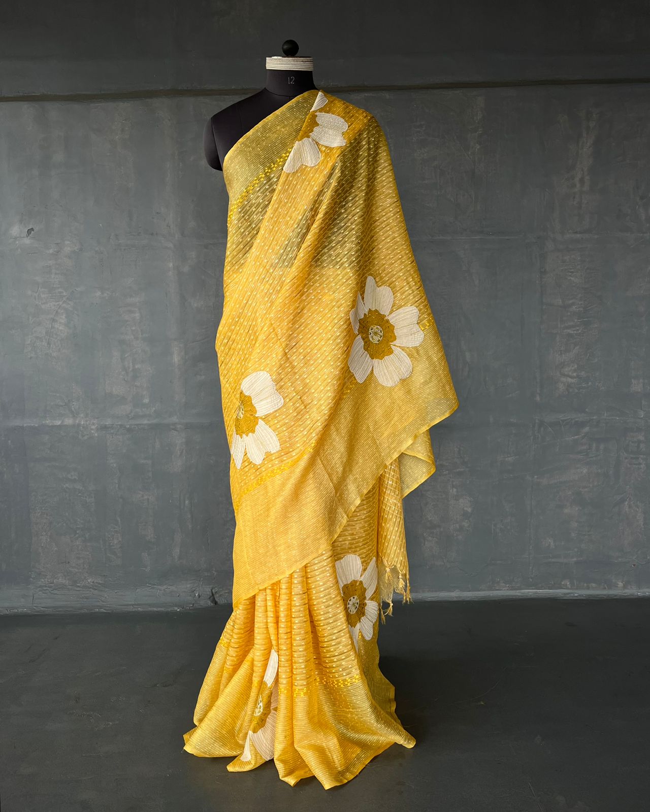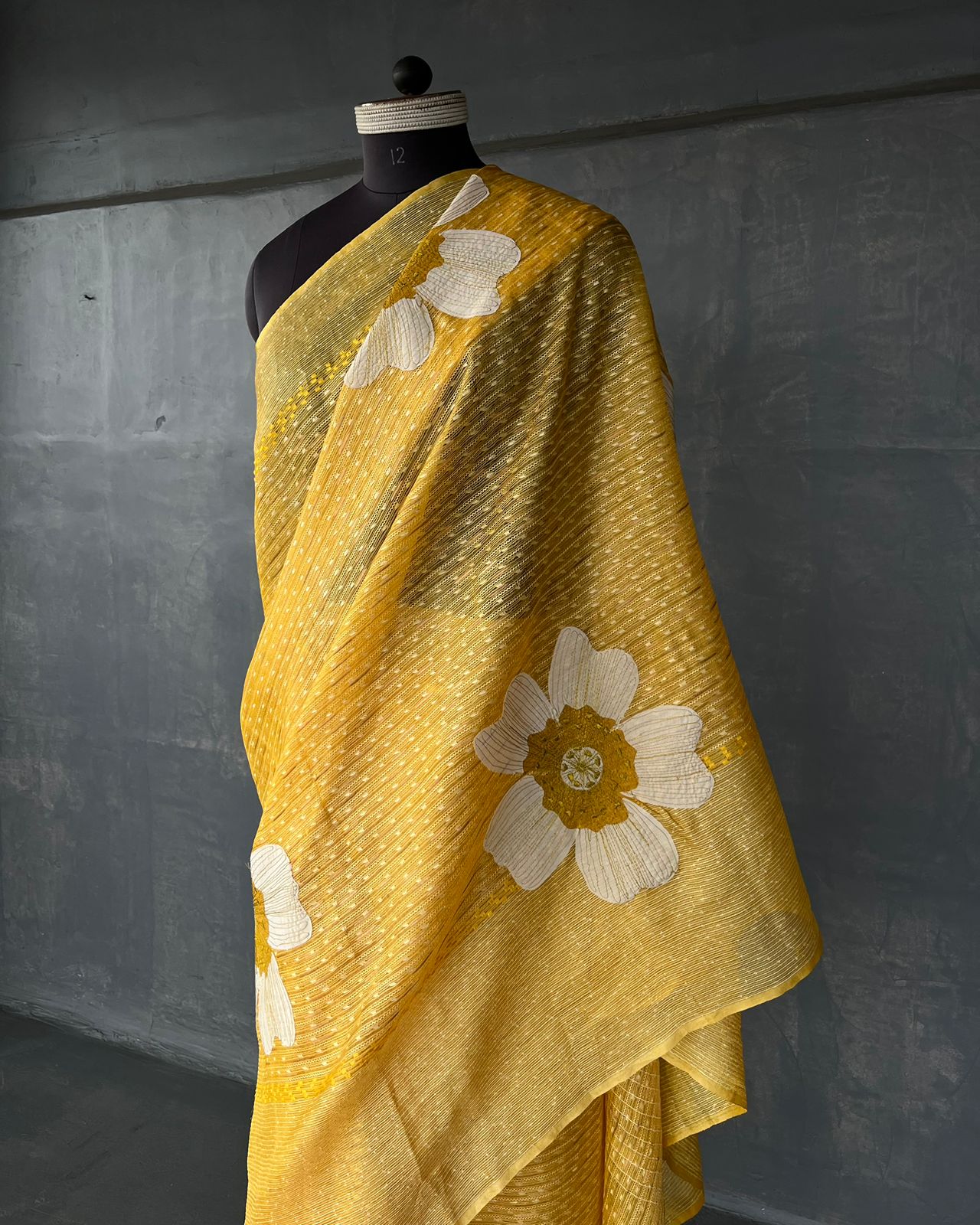 TUSSAR SILK SAREE WITH APPLIQUÉD DETAILS.