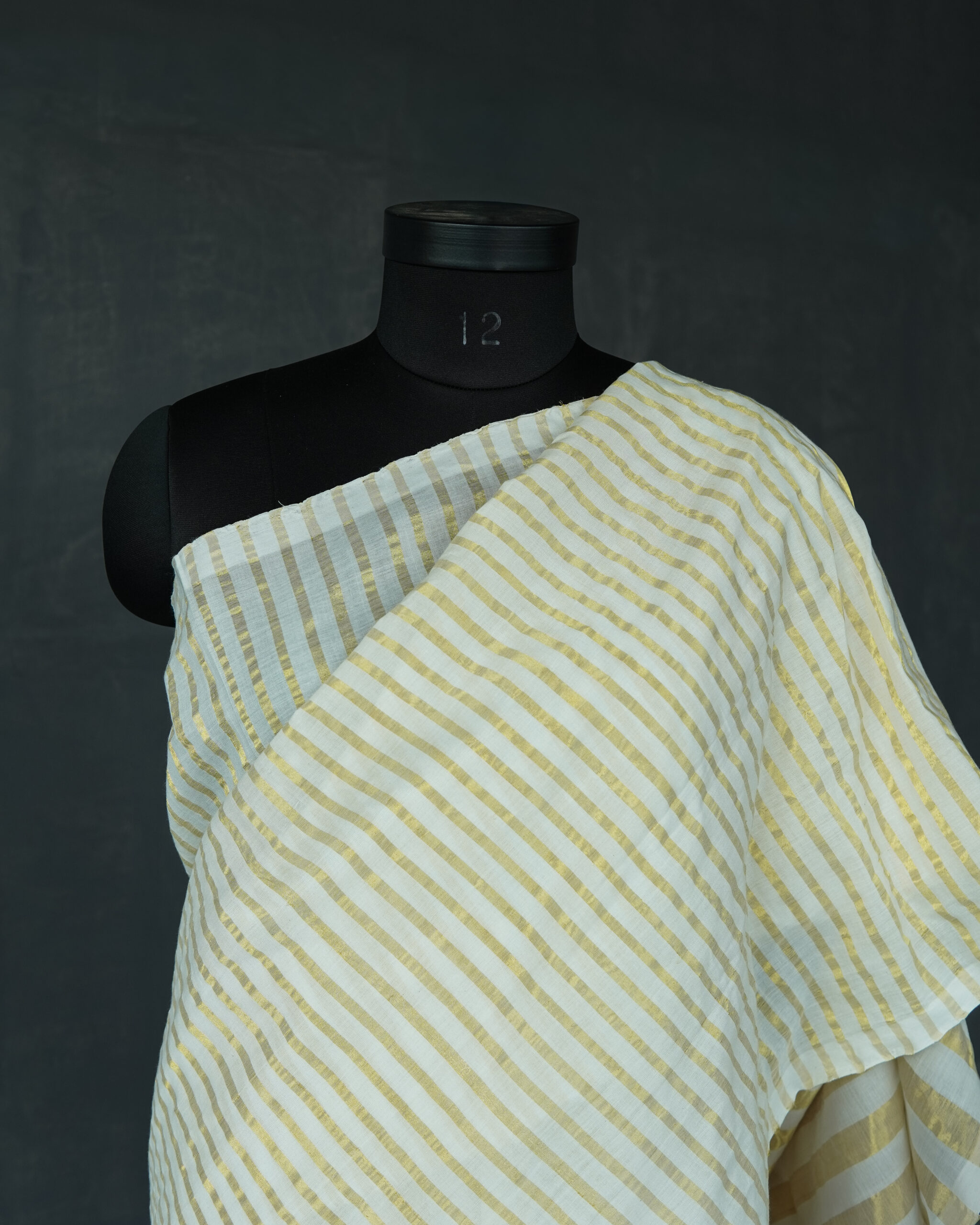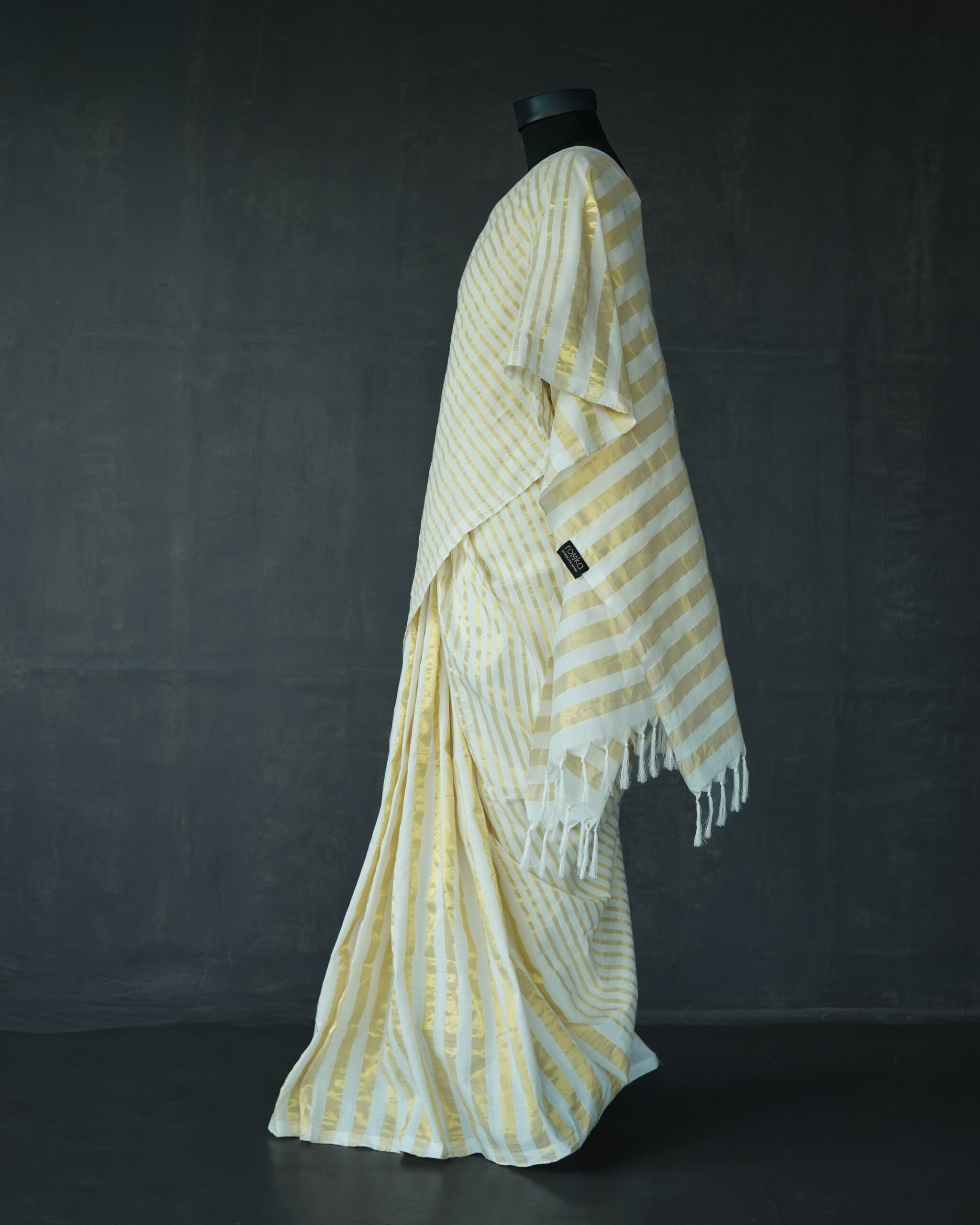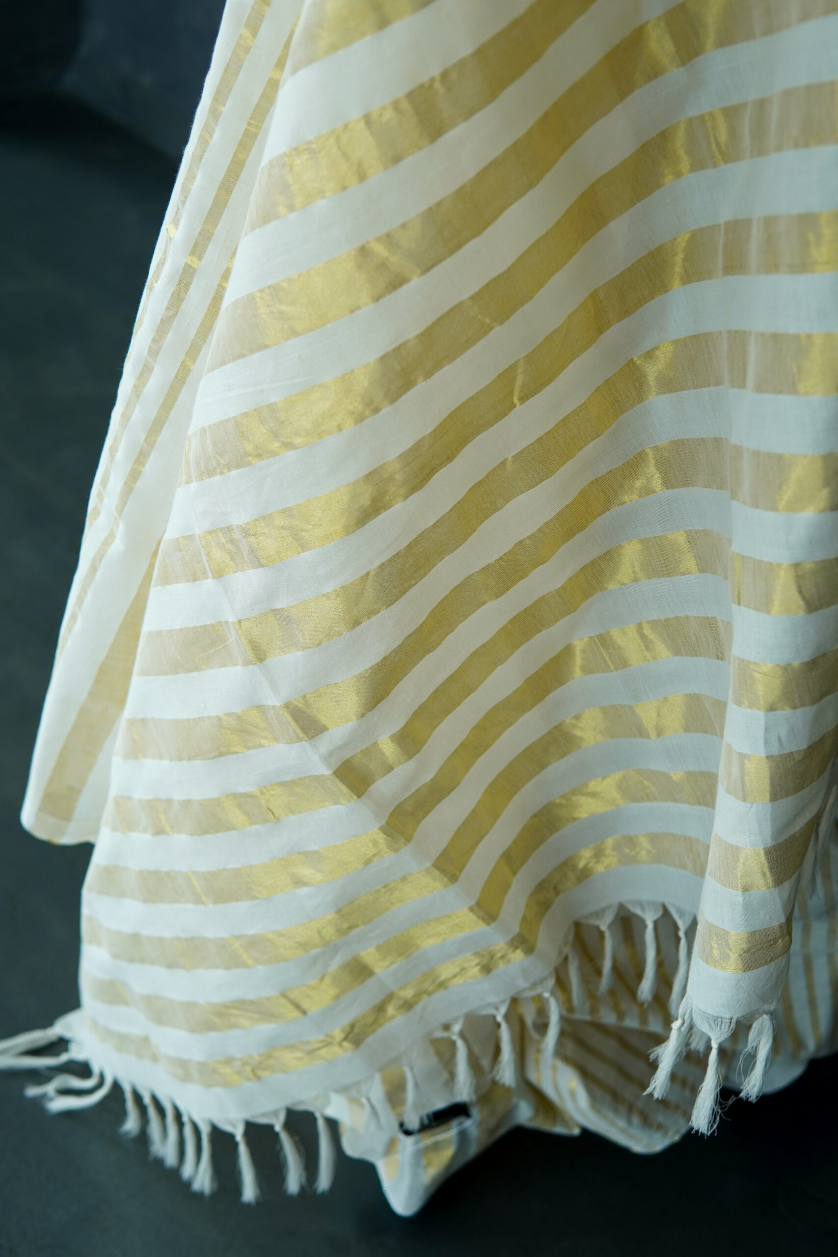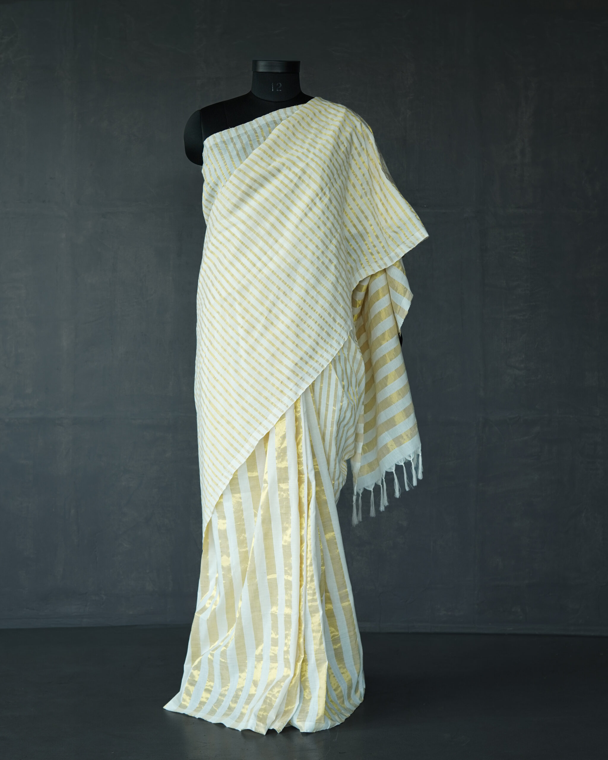 HANDWOVEN COTTON KASAVU SAREE WITH STRIPED BODY.