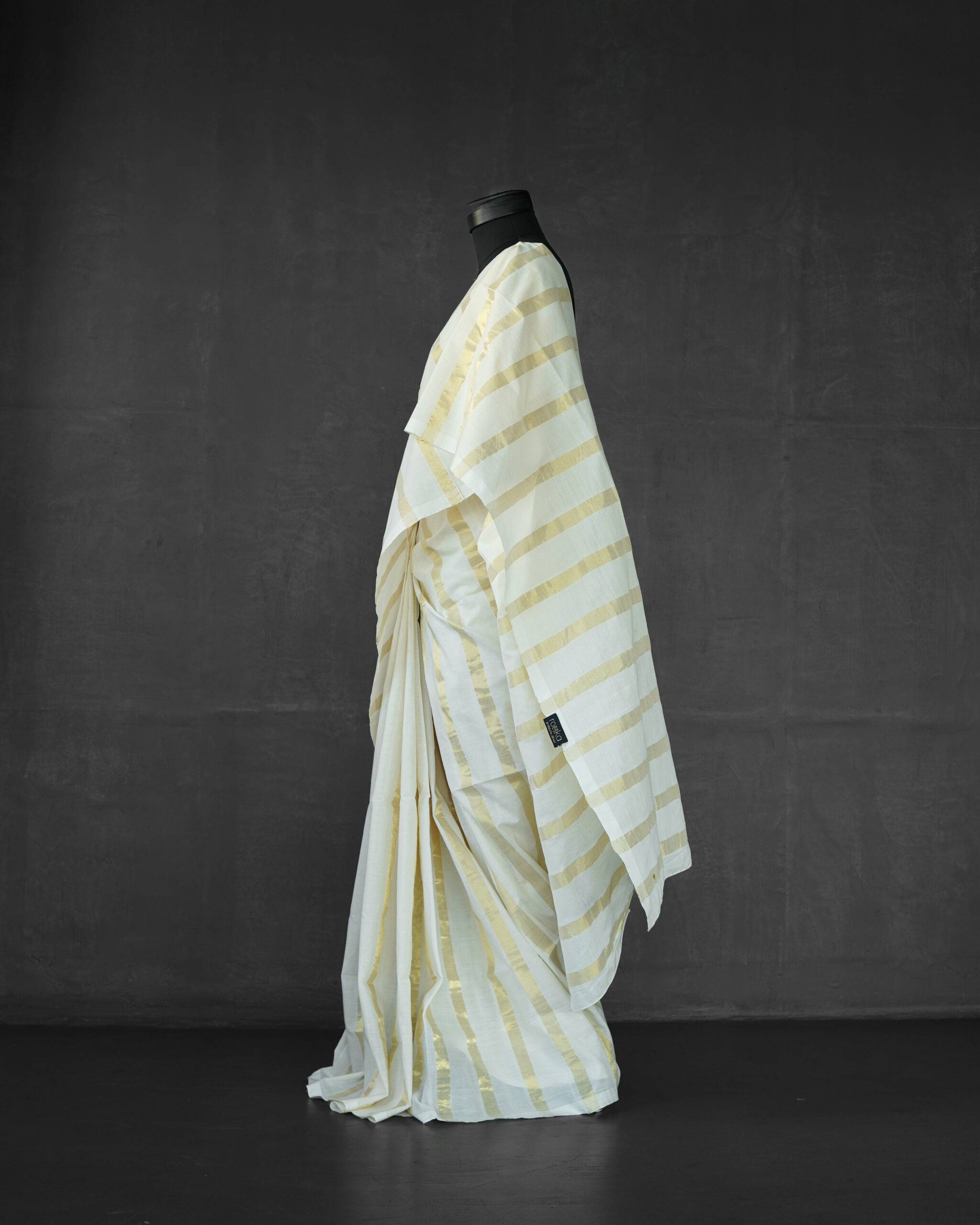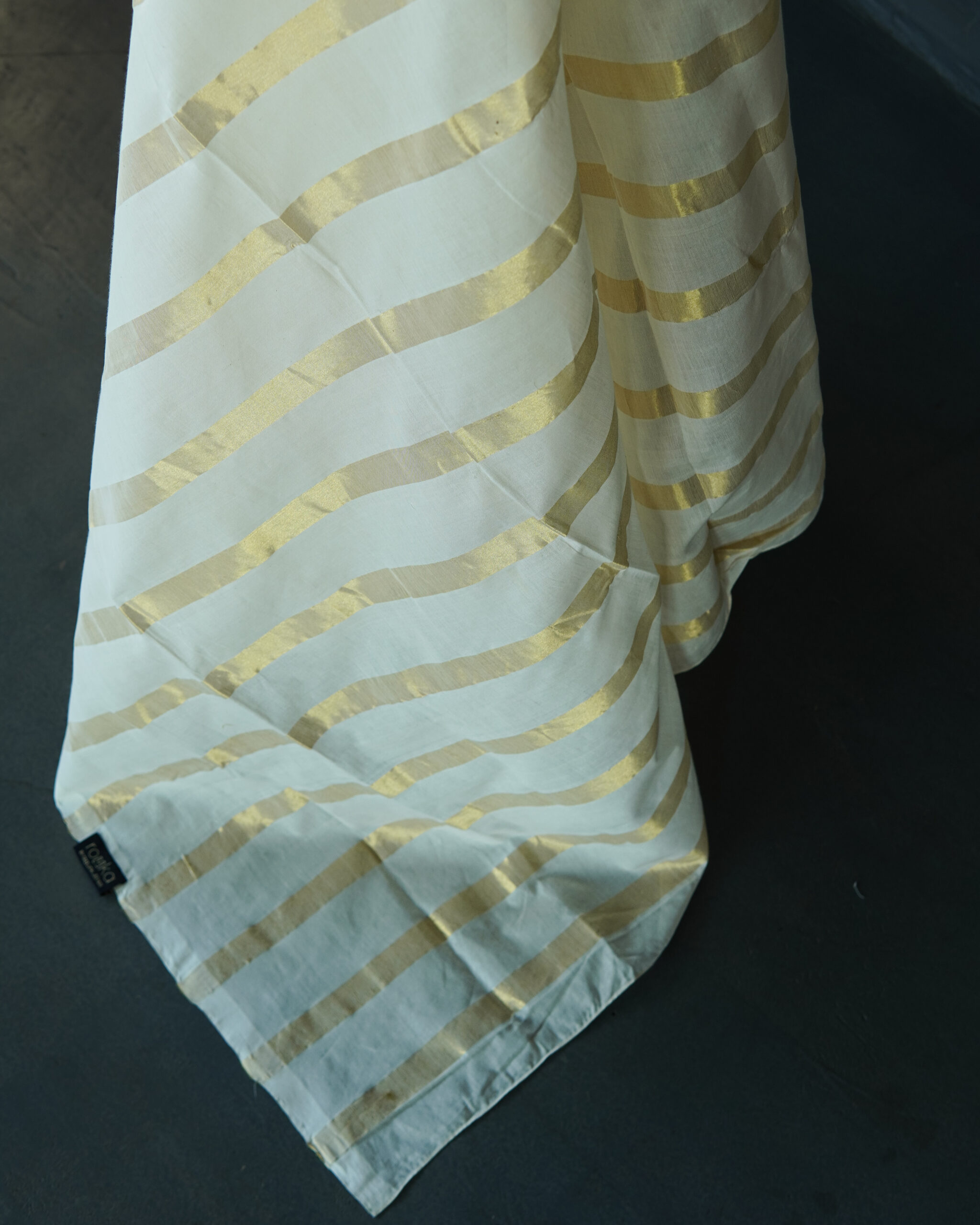 HANDWOVEN COTTON KASAVU SAREE WITH STRIPED BODY.
