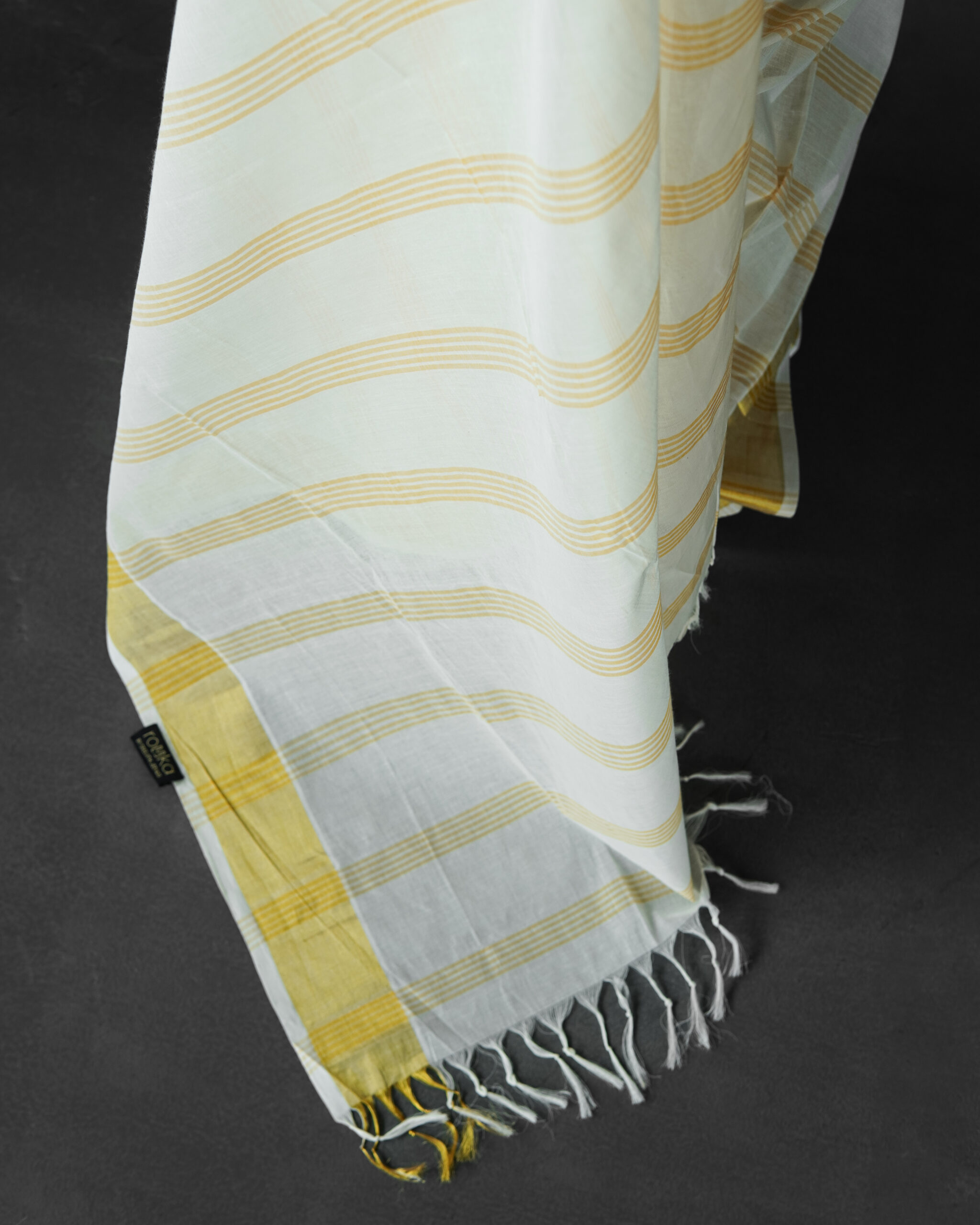 HANDWOVEN COTTON KASAVU SAREE WITH STRIPED BODY.
