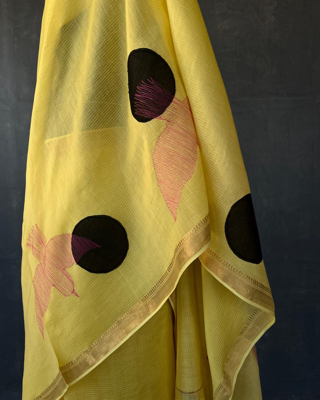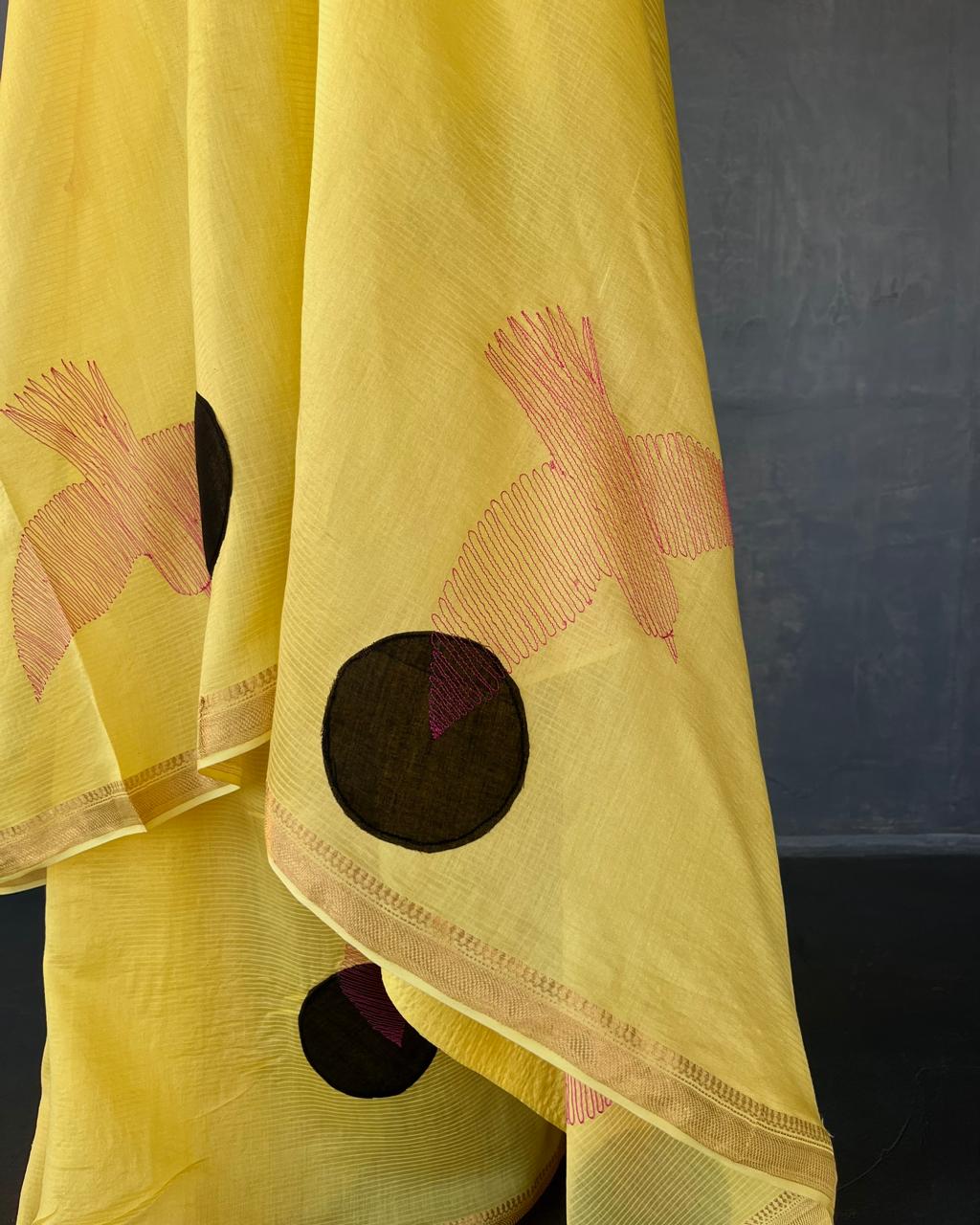 HANDWOVEN COTTON SILK SAREE WITH APPLIQUE AND EMBROIDERY DETAILS .