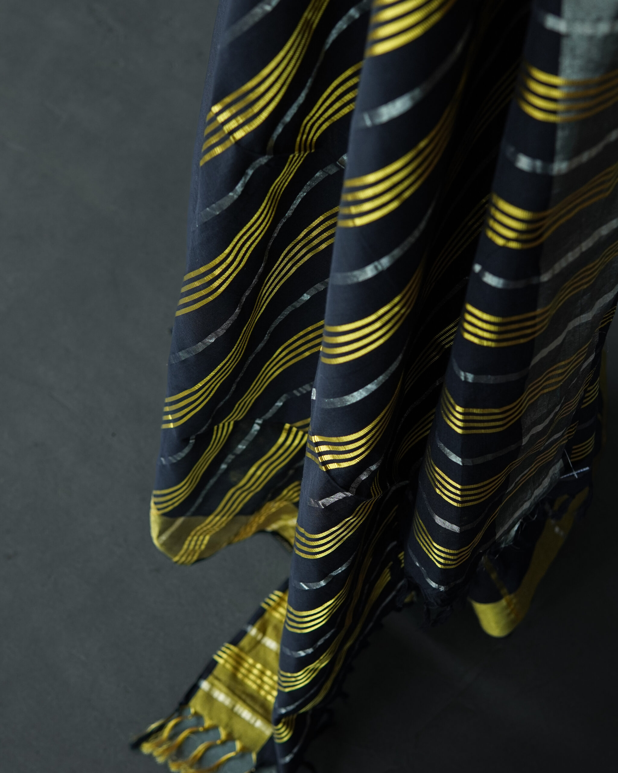 HANDWOVEN COTTON KASAVU SAREE WITH STRIPED BODY.