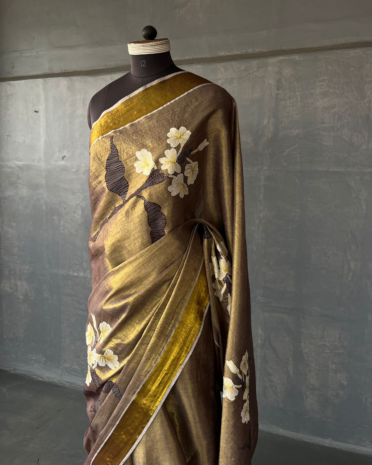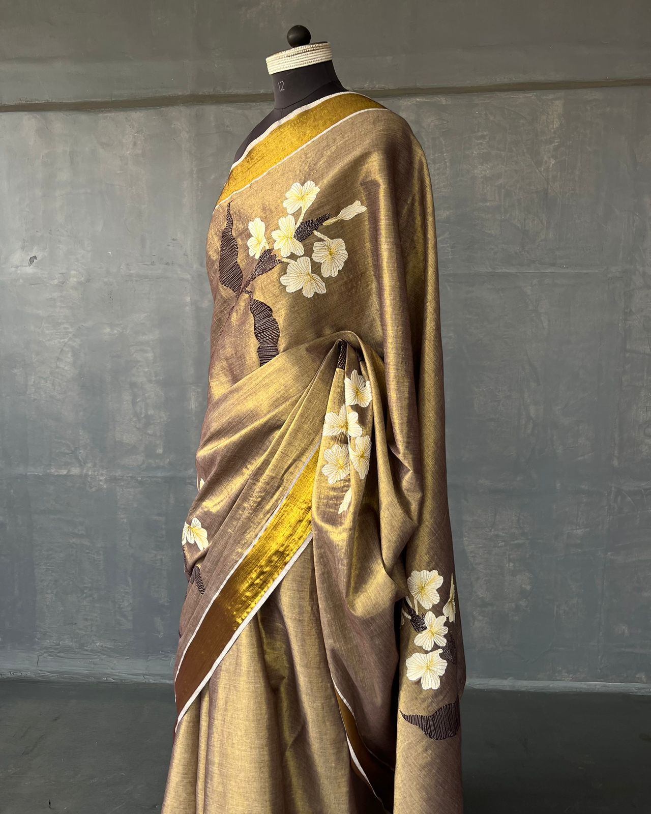 COTTON TISSUE SAREE WITH APPLIQUÉD DETAILS.