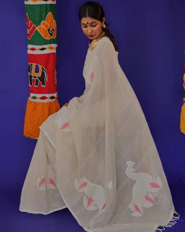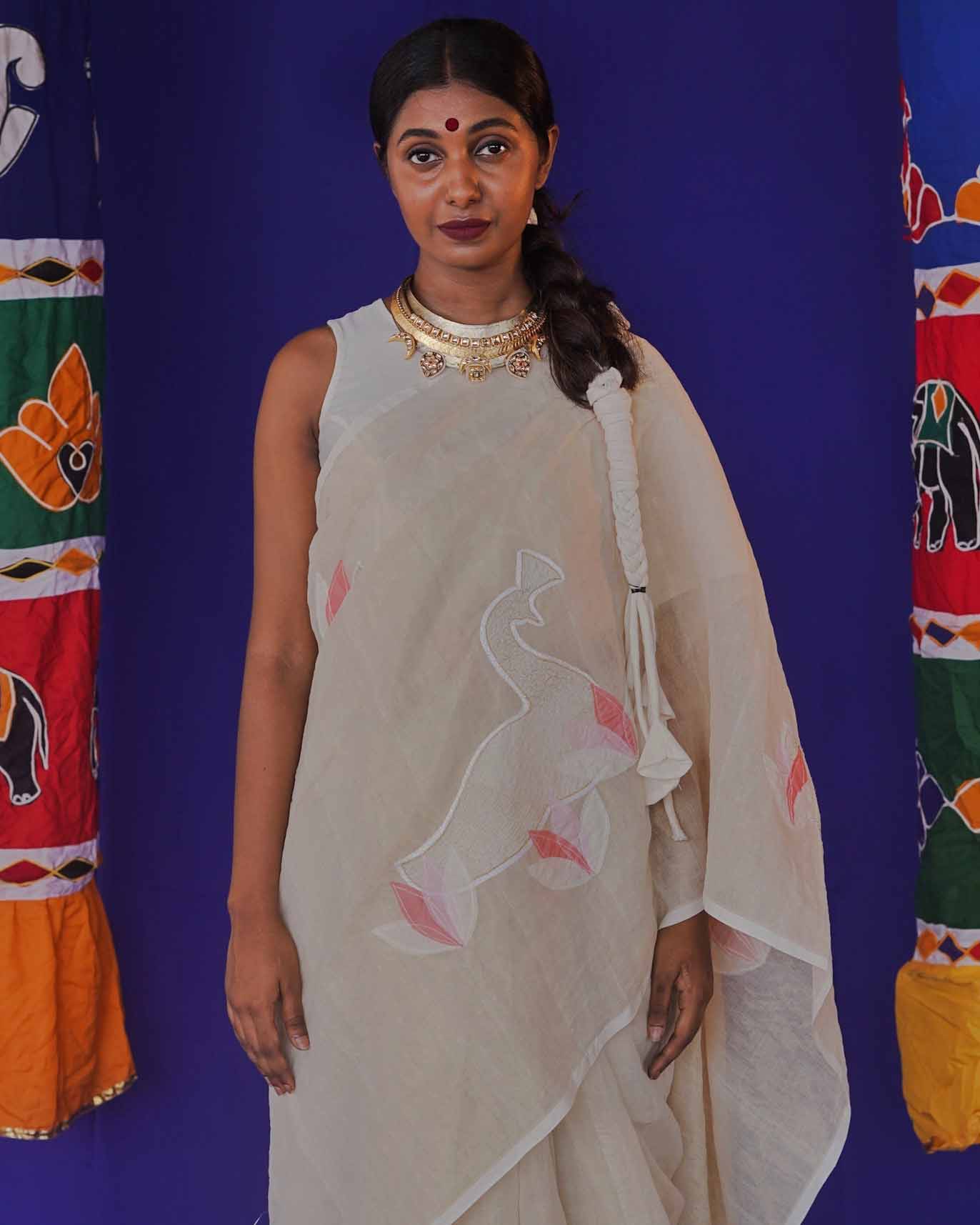 HANDWOVEN KASAVU TISSUE SAREE WITH APPLIQUÉD DETAILS.