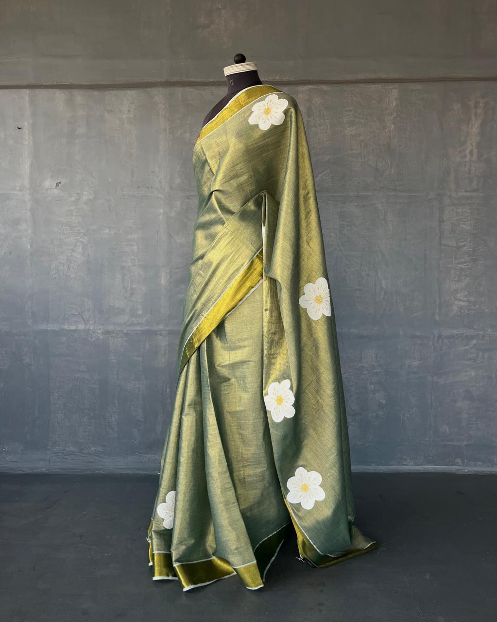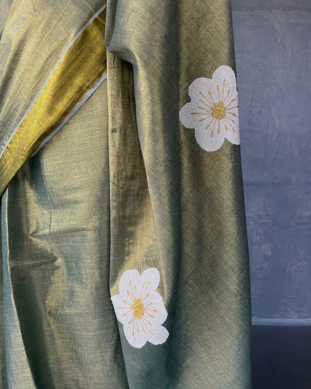 COTTON TISSUE SAREE WITH APPLIQUÉD DETAILS.