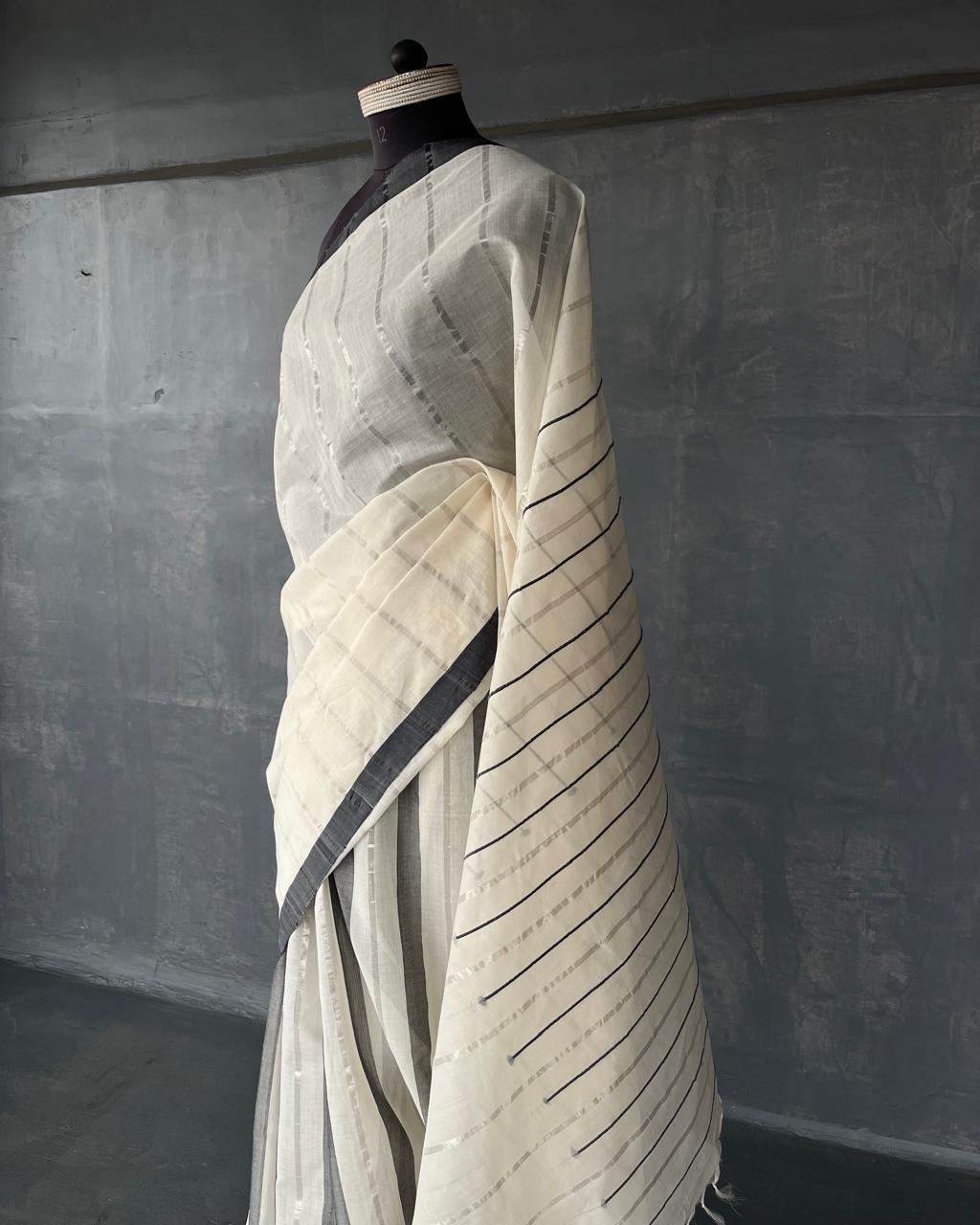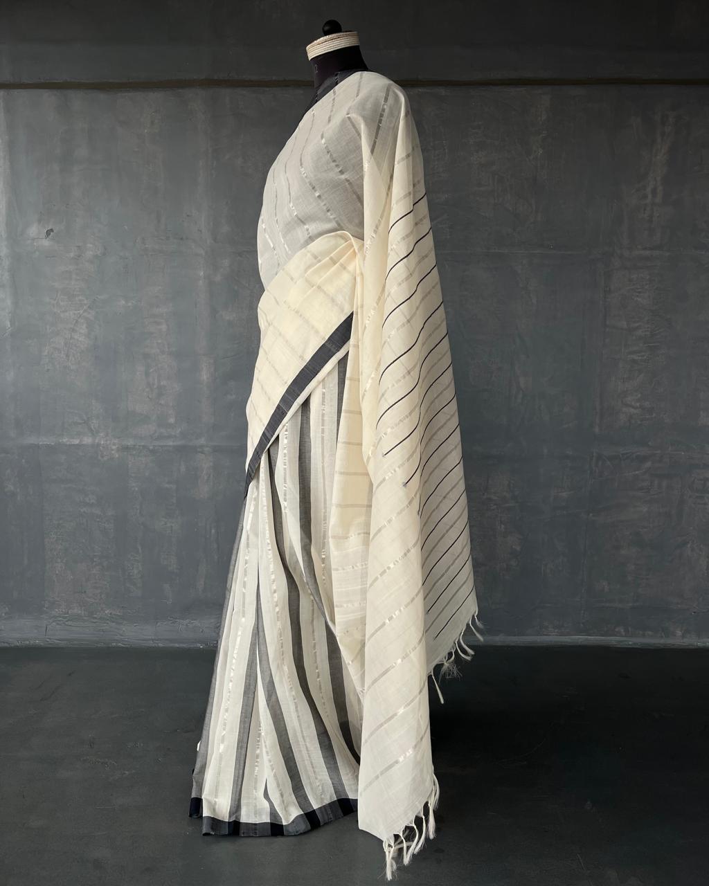 HANDWOVEN COTTON KASAVU SAREE WITH STRIPED BODY.