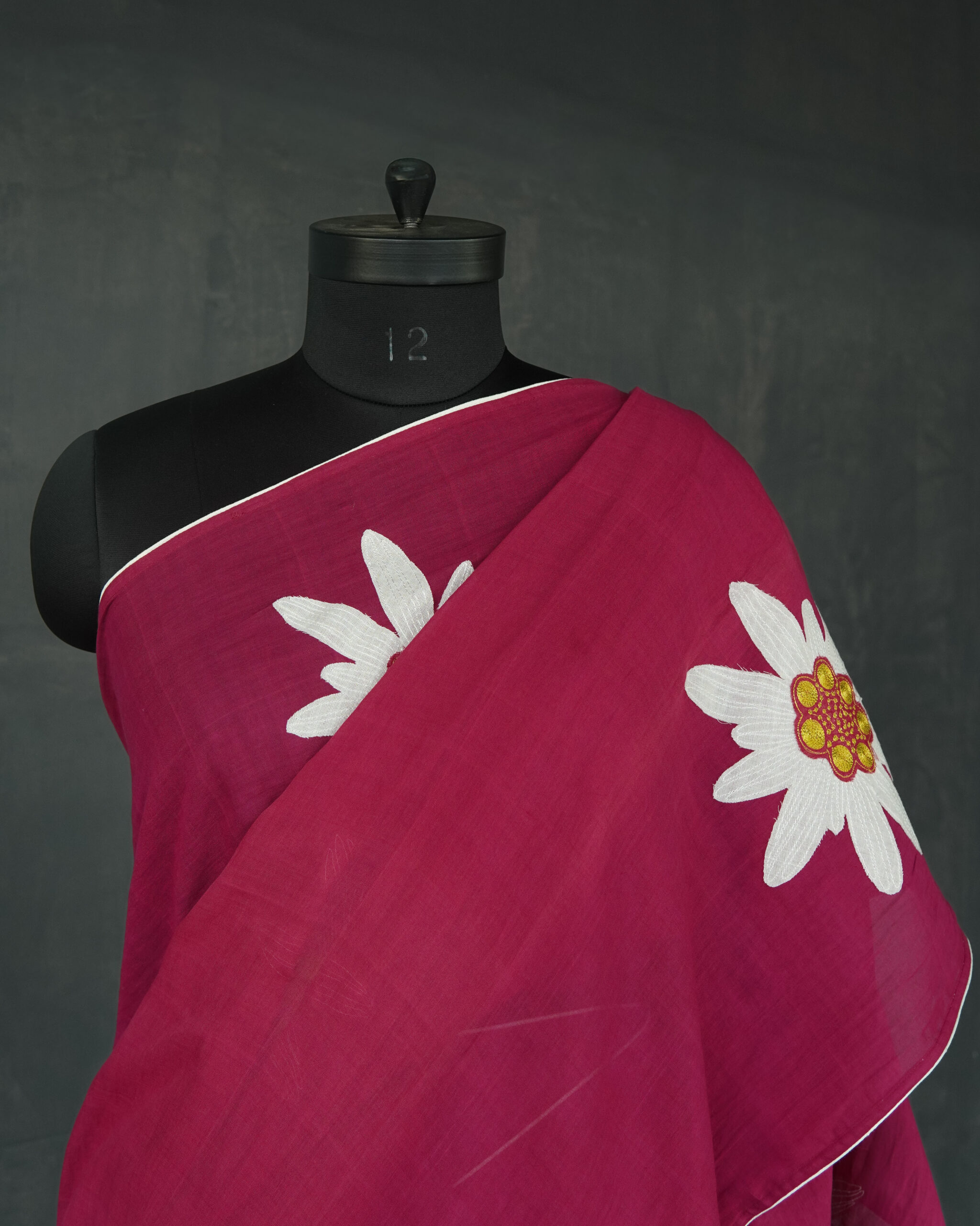 HANDWOVEN COTTON SAREE WITH APPLIQUE AND EMBROIDERY  DETAILS .