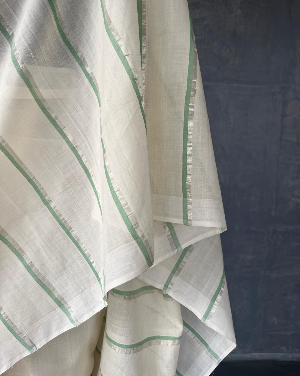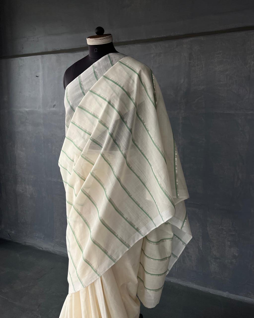 HANDWOVEN COTTON KASAVU SAREE WITH STRIPED BODY.