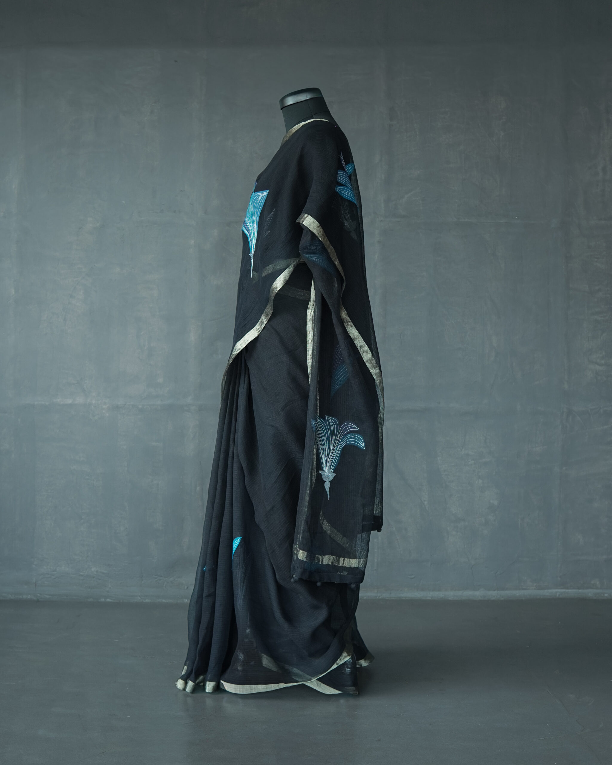 This saree is part of the contemporary wear from the Rouka Timeless range. This saree is a part of our #everyinchoffabric initiative and unfinished edges are a part of the design sensibility.