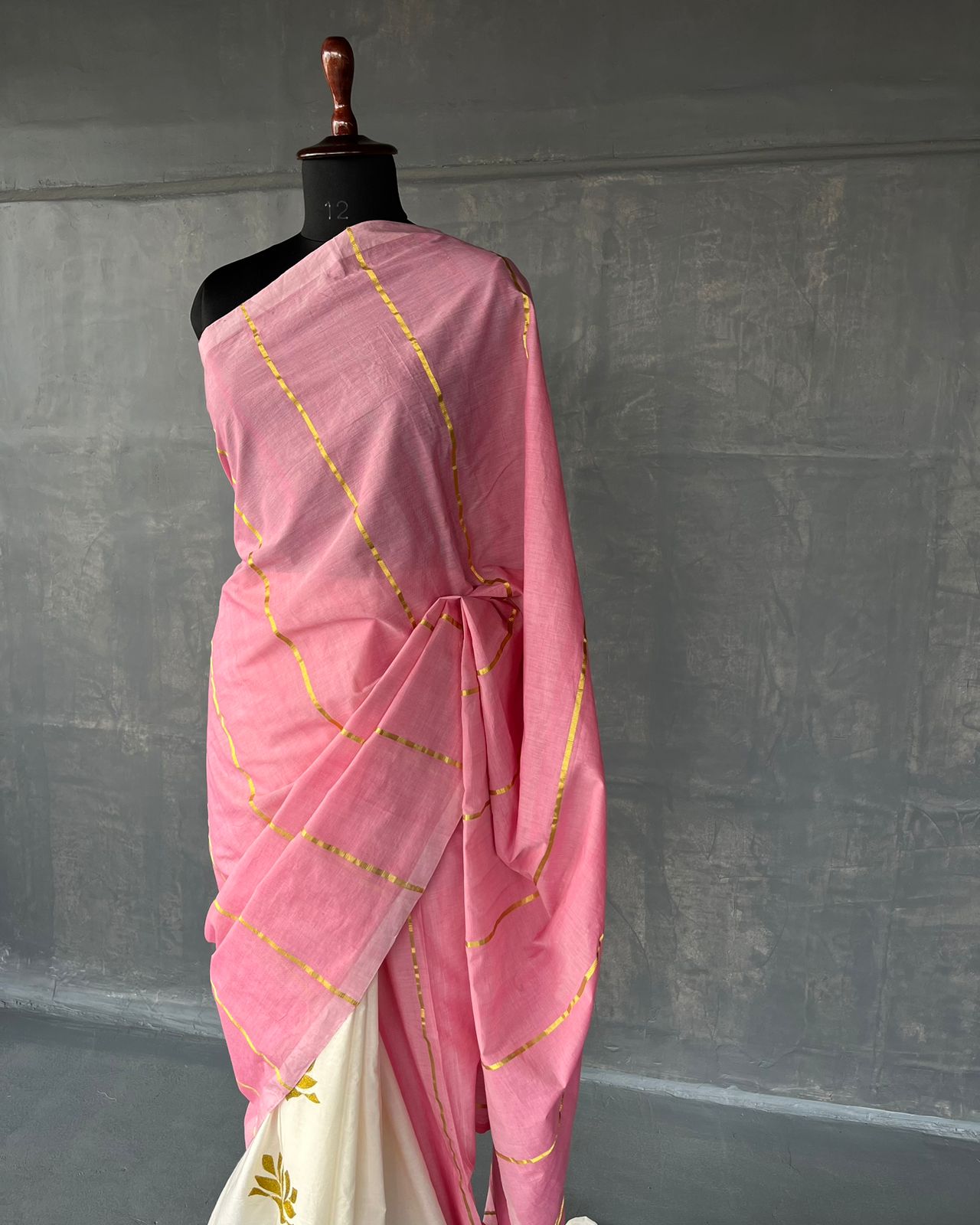 HANDWOVEN COTTON KASAVU SAREE WITH STRIPED BODY.