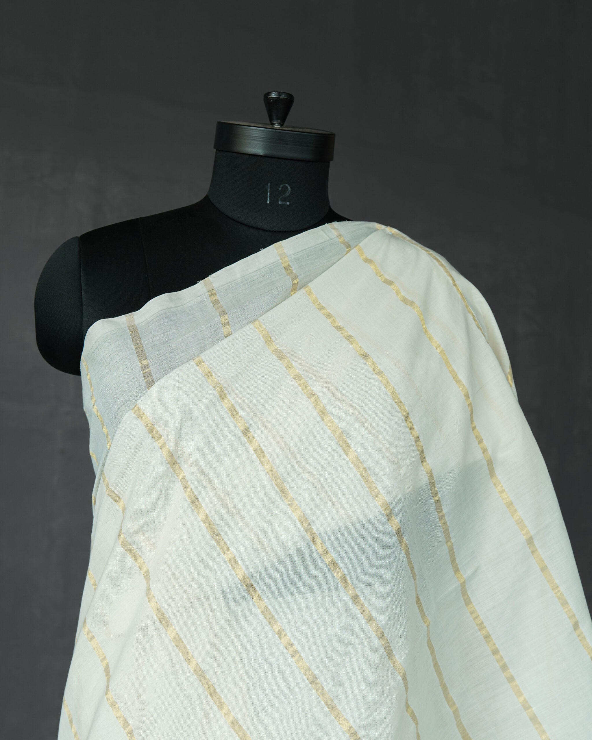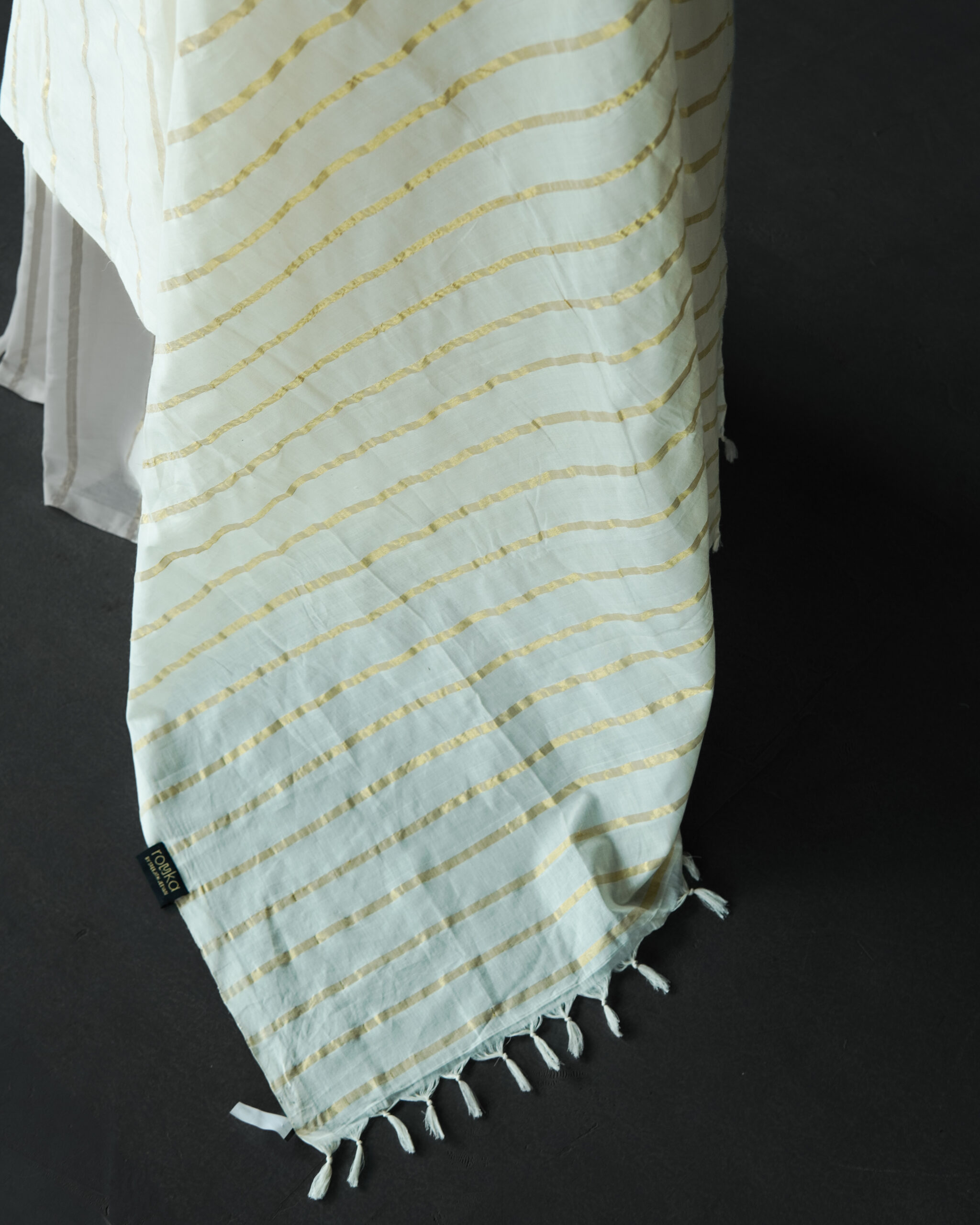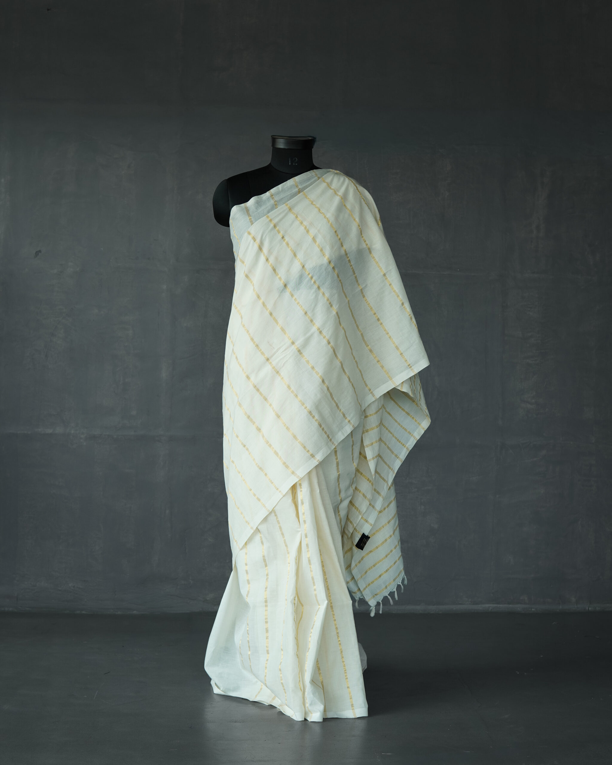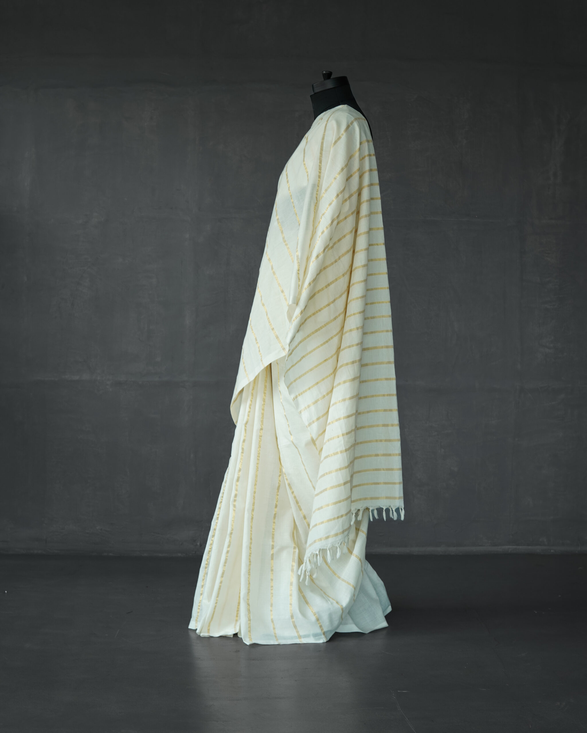 HANDWOVEN COTTON KASAVU SAREE WITH STRIPED BODY.